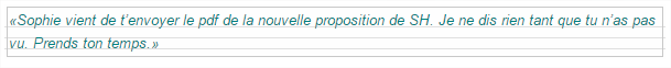 Que dire ? Je suis sorti du rang en parlant. Trop tard pour y rentrer. Mais je ne vais pas donner des conseils de graphisme à des spécialistes !!! Je n’y connais rien. Je ne vais pas non plus faire jouer un droit de préemption, genre « c’est moi l’auteur, c’est moi qui sais, prière de s’aligner ! » Je n’ai jamais pratiqué ce jeu.